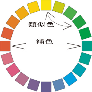 赤、黄、緑、青、紫を順番にぐるりと円形に並べてさらに中間の色相(橙、黄緑など)を加えたものを色相環といいます。距離の近い色同士(例、赤と橙、青と緑)を類似色、円環の反対側の色(例、赤と緑、黄と紫)を補色といいます。色のコーディネートの基本になりますのでしっかり押さえておきましょう。